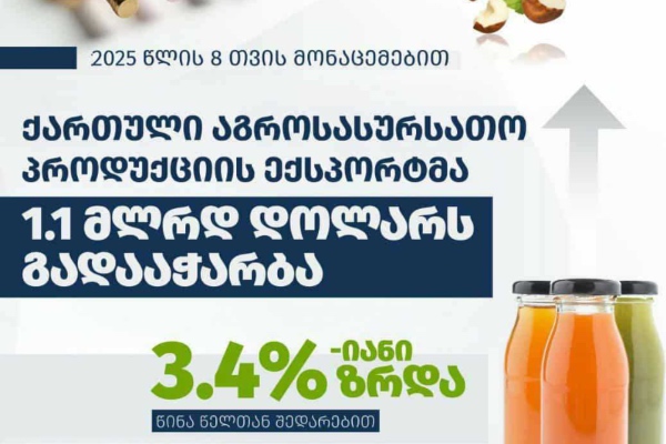 გარემოს დაცვისა და სოფლის მეურნეობის სამინისტროს ინფორმაციით, 2025 წლის 31 აგვისტოს მდგომარეობით, საქართველოდან აგროსასურსათო პროდუქციის ექსპორტის ღირებულებამ 1 118 მლნ აშშ დოლარი შეადგინა, რაც 3.4%-ი...
